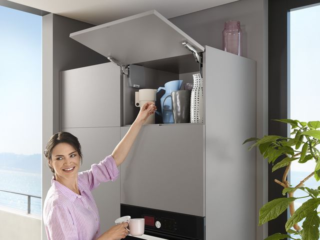 Подъемник AVENTOS HK-S – идеальное решение для малых корпусов, расположенных, например, над холодильником. Благодаря компактным размерам AVENTOS HK-S прекрасно вписывается в небольшие корпуса, позволяя оптимально использовать полезное пространство как на кухне, так и во всех жилых помещениях.